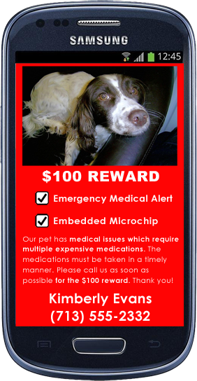 This changes everything in your favor.  We purposely did not put any specific medical issues because not knowing exactly what is wrong may be enough to make any bad guy that picked your pet up drop him off at the next corner.