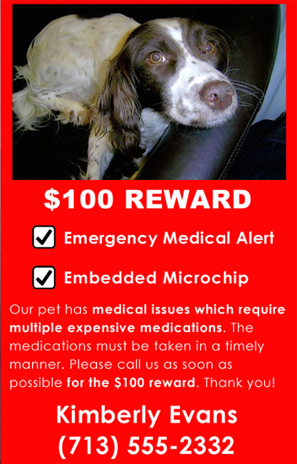 This changes everything in your favor.  We purposely did not put any specific medical issues because not knowing exactly what is wrong may be enough to make any bad guy that picked your pet up drop him off at the next corner.